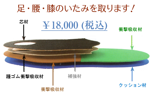 上の断面図にあるインソールは、芯材・補強材・踵ゴム衝撃吸収材・衝撃吸収材・衝撃吸収材からできています。この材質だからこそ実現できる薄さと、強度です!!