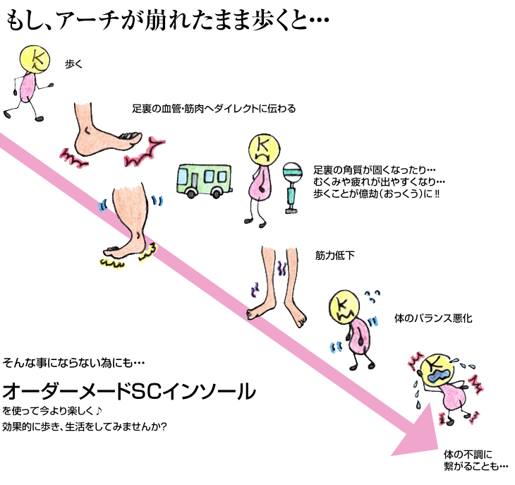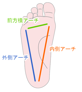 足の裏には3つのアーチがあります。足の裏に全体重がかかるので、加重を吸収・分散するためのクッションの役割。スムーズに歩いたり走ったりするためのバネの役割を行います。そのためそれぞれのアーチがとても大切です